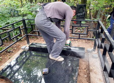 Брусчатку заливаем водой и дожидаемся её полного высыхания. Затем засыпаем в цветник мульчу и вытираем место захоронения от образовавшейся в процессе работ пыли. На этом благоустройство данной могилы окончено, окончательное состояние участка видно на приведённых ниже фото.